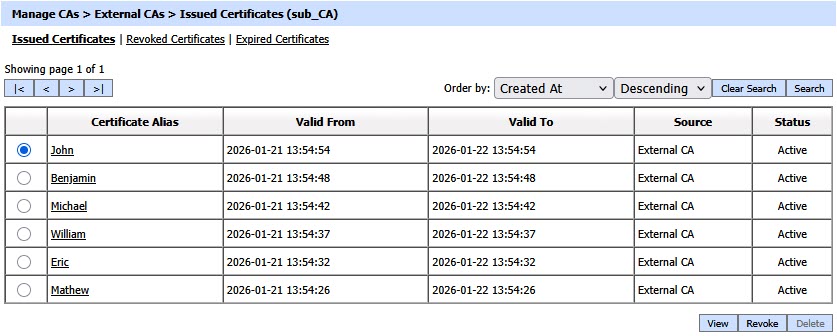 The Revoked Certificates section displays all certificates that have been explicitly revoked by the External CA before their natural expiry. It includes certificates that were revoked while active as well as certificates that were revoked and later reached the end of their validity period. As a result, the tab may contain both currently revoked certificates and revoked certificates that have since expired.