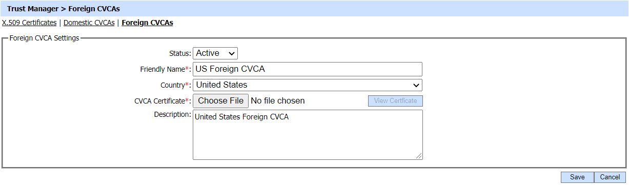 By clicking the New/Edit button, the following screen will be shown where you can configure your Foreign CVCA(s).
