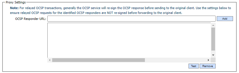 For relayed OCSP transactions, generally the OCSP service will re-sign the OCSP response before sending the response to the calling client. Use these settings to ensure relayed OCSP requests for the configured OCSP Responder URLs are NOT re-signed before responding to the calling client: