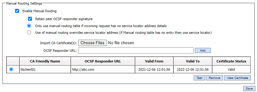 After a CA has been added in the manual routing table click on the Save button so that the list for the manual routing table is updated with the newly added CA. The address of the OCSP responder can be tested using the Test button. Any CA can be deleted later by selecting a particular CA and then clicking on the Remove button.