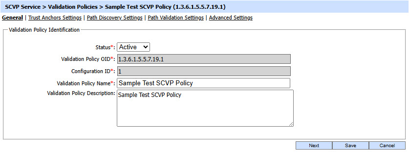 An SCVP validation policy may be marked Active or Inactive. Note an inactive validation policy will not be used to process certificate validation requests.