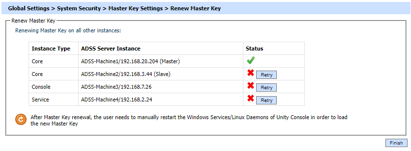 In order to know the reason of failure, the operator can check the <ADSS-INSTALLATION-DIR>\log\console\console.log file of ADSS Server and also the debug logs of that particular instance for which the failure has occurred. The issue can be resolved after knowing the reason of failure and taking appropriate steps for its resolution, but in case if the issue still presides and the operator wants to conclude the renewal process, it can simply click on the Finish button. In this case the master key will be renewed but the local information will not be synchronized with the failed instance and they will appear on the System Security screen as a pending instance as shown in the screen below: