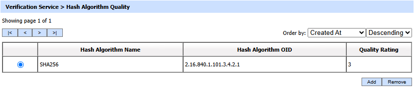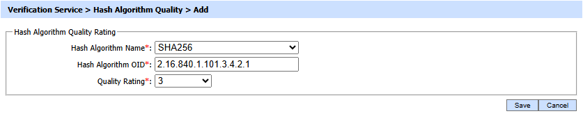 The above table shows a list of already configured Hash algorithm quality ratings. You can add quality ratings for more algorithms by clicking the Add button and entering the details as shown below: