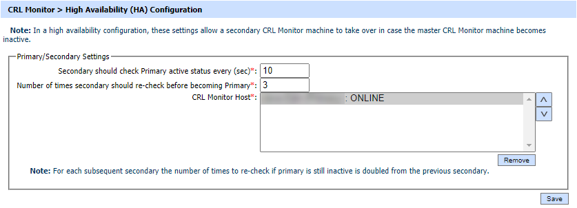 Use this button to remove a CRL Monitor Host from the High Availability configuration. |
