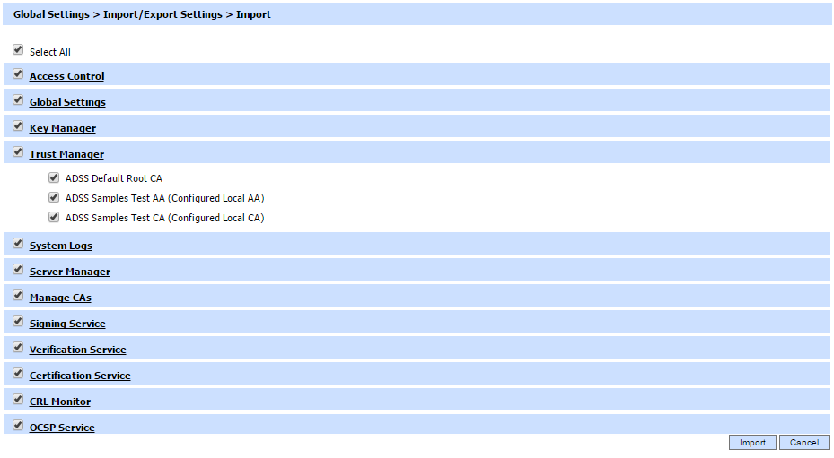 Remember to re-compute HMAC after importing the ADSS Server configurations. See the ADSS Server Installation Guide's section "Upgrading an existing ADSS Server instance" to learn how to re-compute HMAC. |