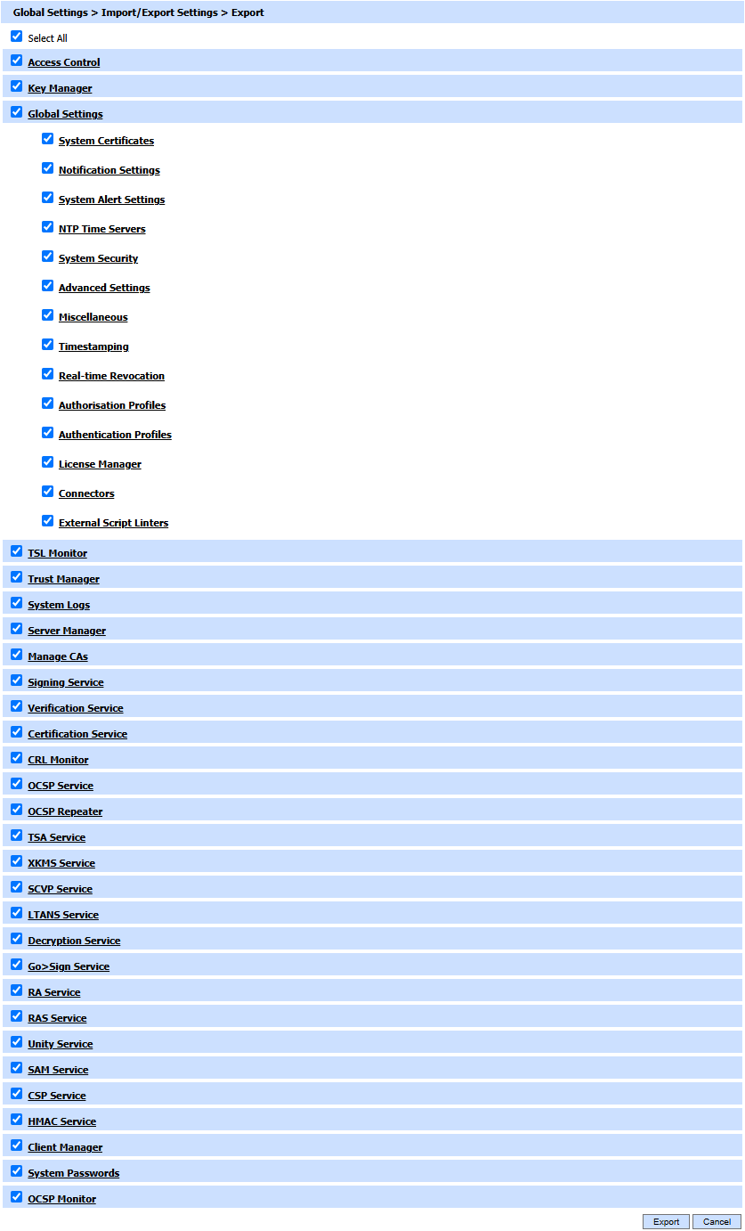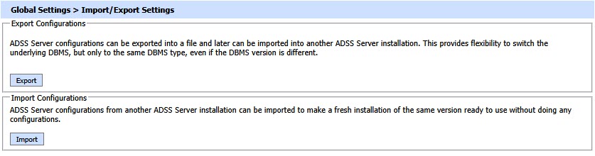 ADSS Server supports exporting all system configurations and also importing into another ADSS Server instance. Both ADSS Server instances MUST be using the: