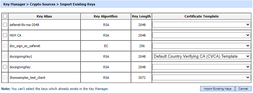Click on the 'Import Existing Keys' button to import the keys from HSM. The following screen will be displayed: