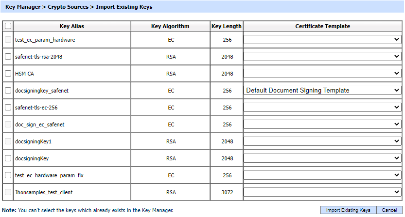 Keys that already exist on a PKCS#11 hardware device can be used within ADSS Server once they have been assigned a specific key usage purpose. To import keys select a crypto profile and Click on the Import Existing Keys button on the Crypto Source page. This will show a list of the keys found on the PKCS#11 device as shown in the example below. The public key details that need to be imported can be selected and assigned a particular certificate template: