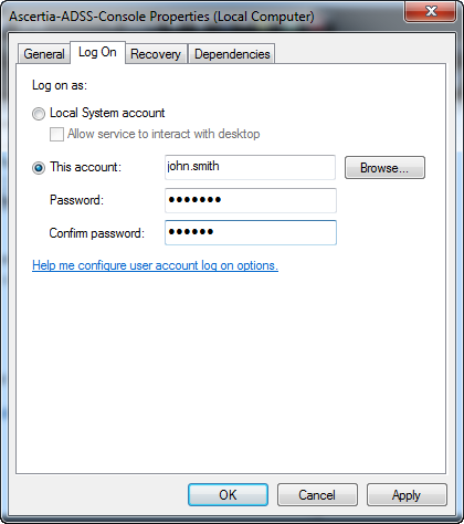 - ADSS Server service instances (ADSS Core, ADSS Console and ADSS Service) must be running under the windows user whose keys you are wishing to utilize. Here is a screenshot of how you can configure it: