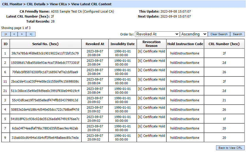 The records in the list of instantly revoked certificates for a particular CA can be sorted in either Ascending or Descending order by selecting a table column from the drop down list.