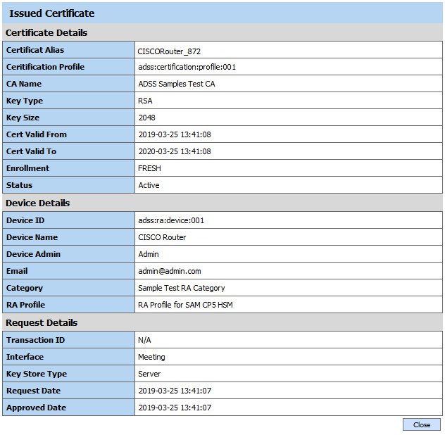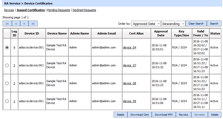 Clicking the Issued Certificates link at the top shows the list of generated certificates requested via SCEP, PKCS#10/CSR, Face to Face meeting or the PFX interfaces. RA Operator can select a certificate and click Details to view more information or click Revoke to initiate the revocation process or click Download to see the issued certificate.