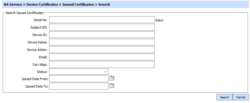 Enter search criteria based on the Serial No, Subject DN, Device ID, Device Name, Device Admin, Email, Cert Alias, Status, Issued Date from and Issued Date to. If more than one search parameters is provided, these are combined using the AND operator and the results are presented accordingly.