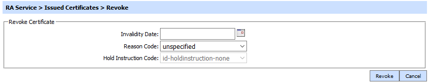 Clicking this button requests ADSS Server to revoke the selected certificate after providing the reason to revoke. The status will change to Revoked. The button is enabled if certificate status is Active or the revocation status is suspended. If already suspended then the label of the button becomes Re-Instate.