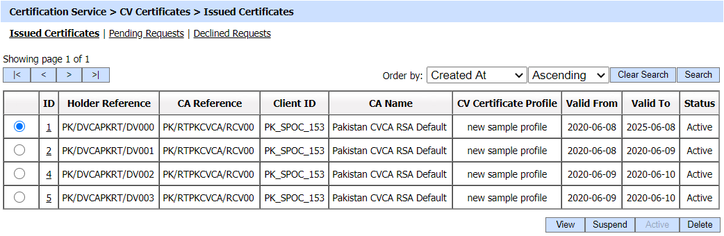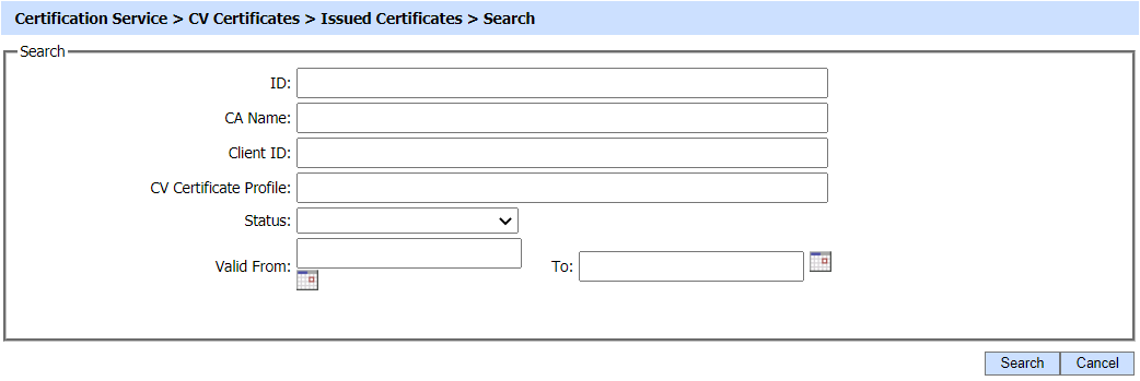 A particular CV Certificate can be searched based on ID, CA Name, Client ID, Certification Profile, Status, Valid From and Valid To. If a search is based on multiple values, then these will be combined together using the “AND” operand, and thus only records that meet all the criteria will be presented.