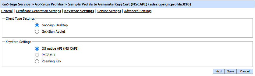 This page is used to configure the key store settings where the key will be stored once generated through Go>Sign applet.