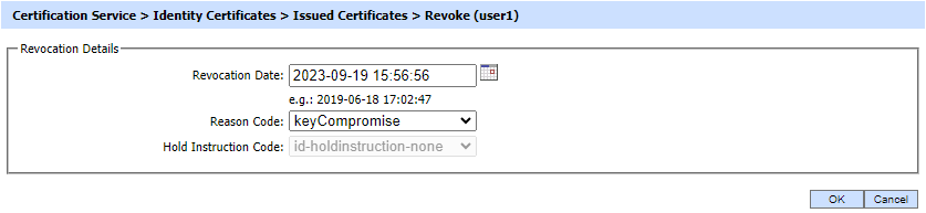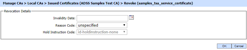 Clicking on Revoke button will show the following screen where invalidity date, revocation code and hold instruction code can be provided before revoking the certificate: