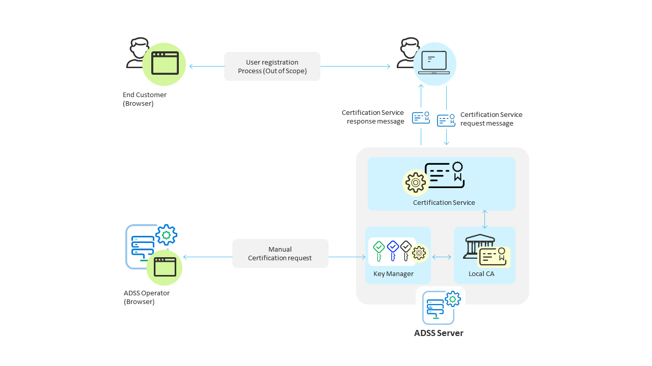 The local CAs configured in Manage CAs module can automatically certify the keys being generated by the certification service. The Local CAs can also certify keys which are manually generated by ADSS Server operators using the ADSS Key Manager module.