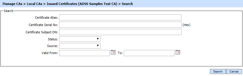 By clicking on the Search button on Issued Certificates main page will display following screen: