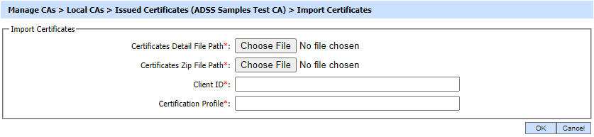 By clicking on the Import Certificates button, the following screen will be displayed where user can browse to the issued certificate(s) detail file or to certificate(s) zip file issued by the selected Local CA: