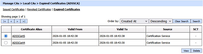The Expired Certificates section lists certificates that have reached the end of their validity period and are no longer active. These certificates are automatically moved from the issued certificates tab once they expire and are retained for reference, audit, and renewal-related operations.