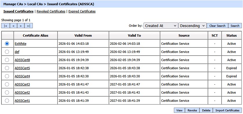 When certificates are imported using a ZIP file, they are automatically placed into the appropriate sections based on their status. Issued certificates appear under the Issued Certificates tab, revoked certificates under the Revoked Certificates tab, and expired certificates under the Expired Certificates tab. |