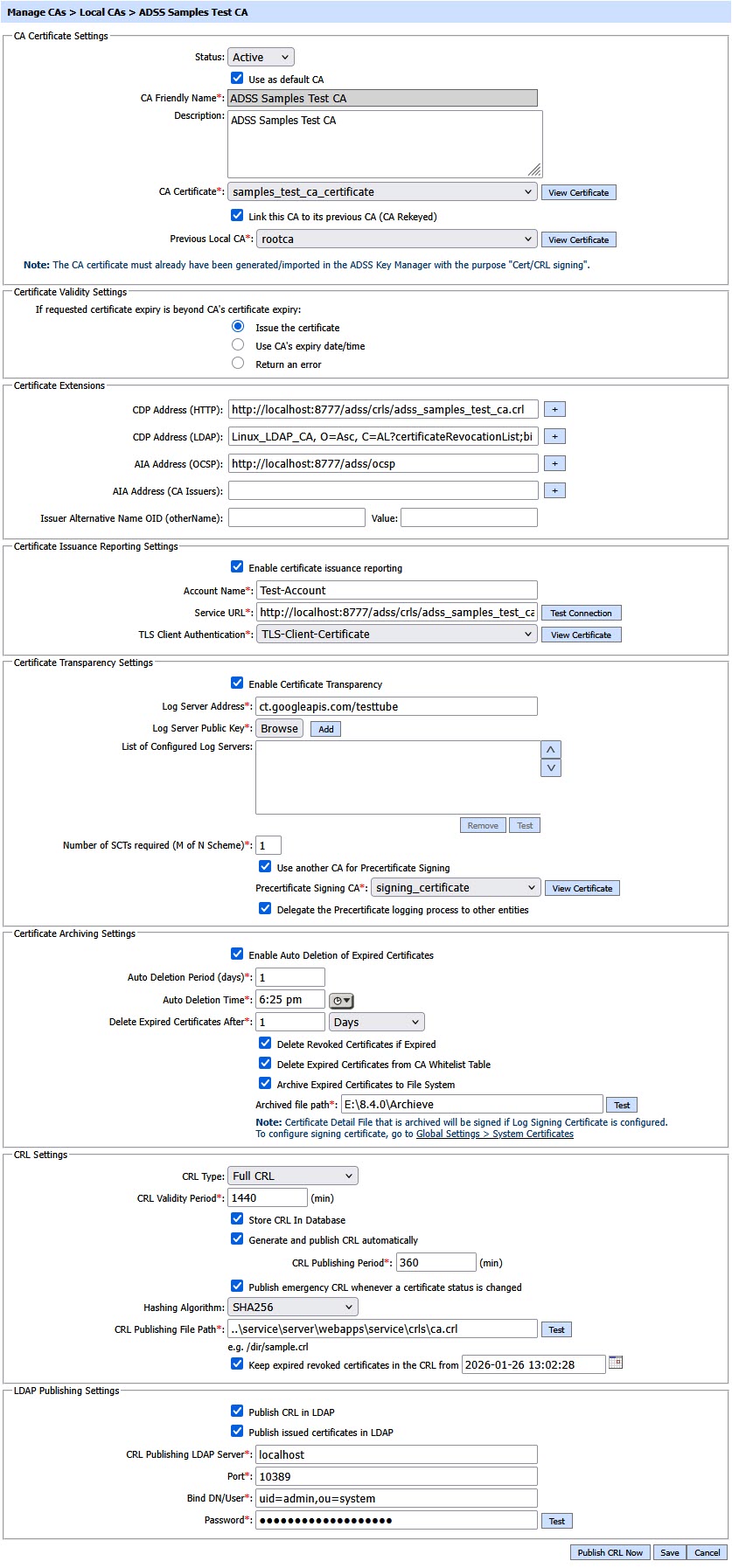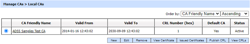 To configure an ADSS Server local CA, first generate (or import) a key pair for use as a 'Local CA'. The key pair must be assigned the purpose Cert/CRL Signing within the ADSS Key Manager module. The Local CA public key will then need to be certified using either a self-signed certificate or a certificate issued by higher-level CA. This Local CA can then be configured for online certification using the Manage CAs module. The following is the screen where you can configure the CAs.