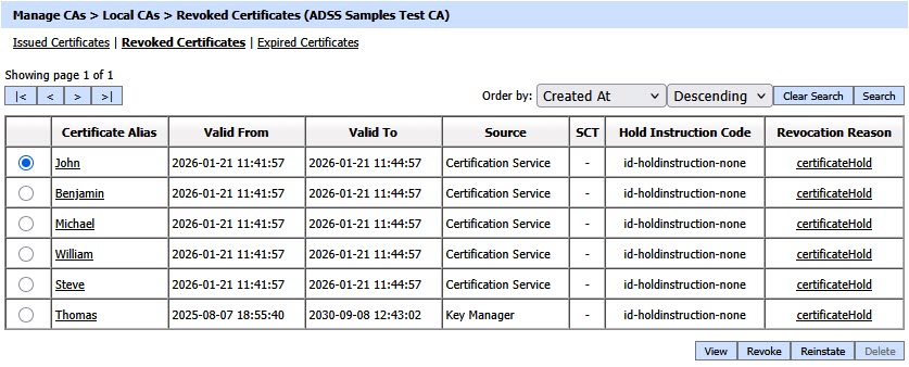 The Revoked Certificates section displays all certificates that have been explicitly revoked by the Local CA before their natural expiry. It includes certificates that were revoked while active as well as certificates that were revoked and later reached the end of their validity period. As a result, the tab may contain both currently revoked certificates and revoked certificates that have since expired.