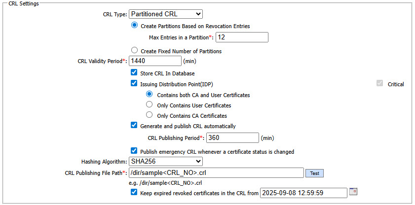 In case of Partitioned CRL with the Create Partitions Based on Revocation Entries option, the following screen will be displayed: