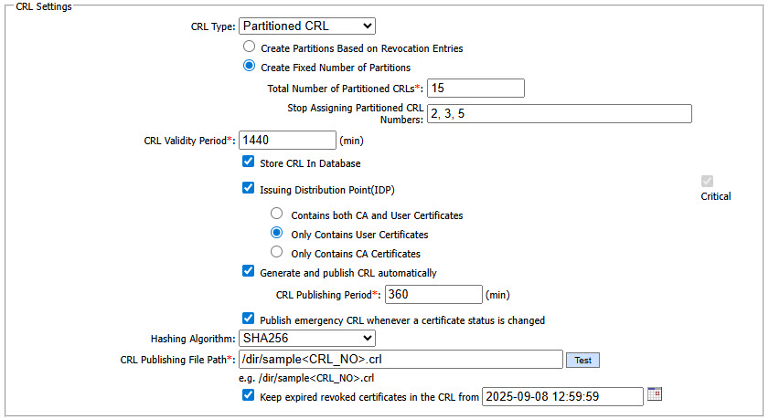 This field allows the operator to set the total number of partitions to be created for the CRL. For example if the operator sets the value '10' in the field, it will create 10 partitions for that CRL. Newly generated certificates will be assigned a partition number picked up randomly within the range e.g. 1-10. The partitions will be published at the path given in CRL Publishing File Path field.