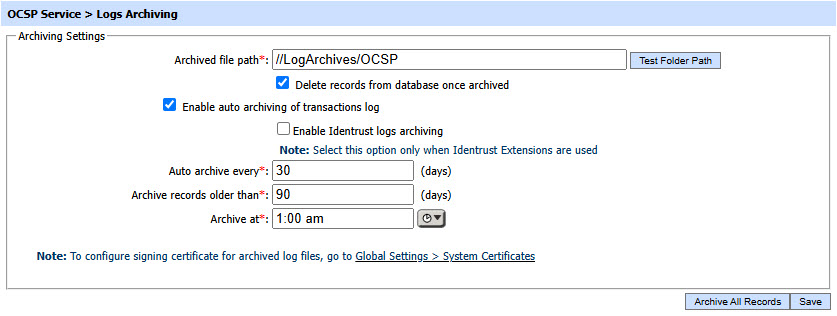 The integrity of archived logs can also be preserved by signing the archived log file using a Log Signing key, this configuration is available within the Global Settings > System Certificates module.
