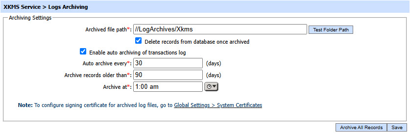 The integrity of archived logs can also be preserved by signing the archived log file using a Log Signing key, this configuration is available within the Global Settings > System Certificates module.
