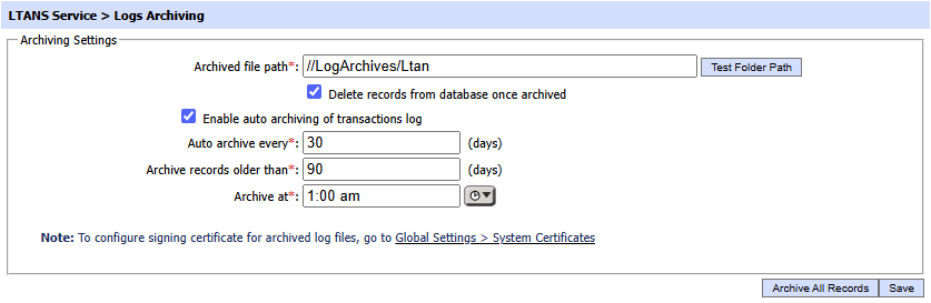 The integrity of archived logs can also be preserved by signing the archived log file using a Log Signing key, this configuration is available within the Global Settings > System Certificates module.