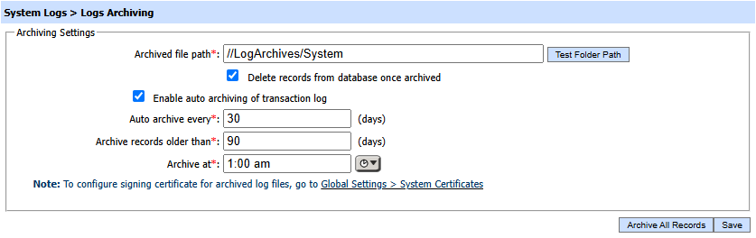 The integrity of archived logs can also be preserved by signing the archived log file using a Log Signing key, this configuration is available within the Global Settings > System Certificates module.