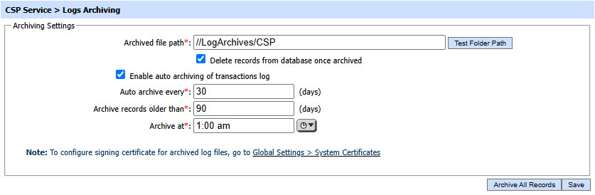 The archiving module allows operators to enable/disable auto-archiving and/or perform manual archiving of the transactions log for this service. By enabling the auto-archiving option, logged transactions are automatically moved from the database to a zipped CSV file periodically. You can manually archive the logs as well by clicking the Archive Now button at the bottom. Records moved to a zipped CSV file can be imported back into the ADSS Server for auditing purpose later on, details are available here.