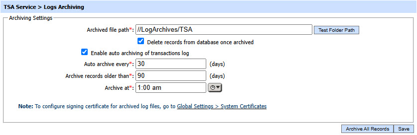 The integrity of archived logs can also be preserved by signing the archived log file using a Log Signing key, this configuration is available within the Global Settings > System Certificates module.