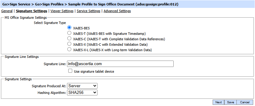 Select the MS Office (XAdES) signature type that will be produced by this profile.See the Supported Signature Types section for more details for the types of signatures supported by Go>Sign Service.