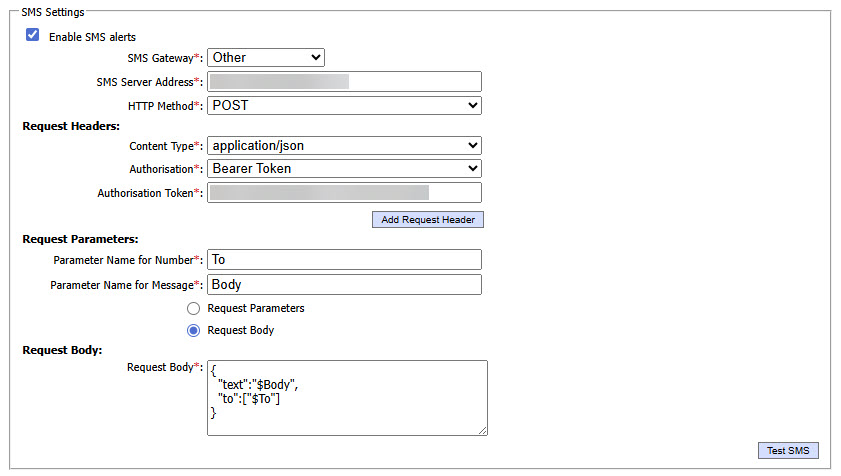 When the Request Body radio button is selected, the user can configure the SMS gateway by defining the SMS configuration content in the Request Body field within the ADSS Server Console. In the request body configuration, placeholders must be used for values that the system will replace, such as the recipient’s phone number or the message content. These placeholders should begin with a '$' symbol and must match the names defined in the 'Parameter Name for Number' and 'Parameter Name for Message' fields. For example, if you specify 'To' as the 'Parameter Name for Number', then the request body should include an entry like "to": ["$To"]. Here, $To serves as a placeholder that the system will replace with the actual phone number by clicking on the Test SMS button, and then defining the Receiver Number. The same approach applies to the Parameter Name for Message field. Ensure that the placeholder in the request body matches the configured parameter name and starts with a $ symbol. |