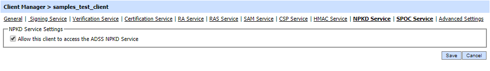 Select the Allow this client to access the ADSS NPKD Service checkbox. This ensures that the client can make requests to NPKD Service. Note that all the communication with NPKD Service can only be established via TLS Client Authentication i.e. The client certificate must be registered in Client Manager of ADSS Server in order to establish communication with NPKD Service.