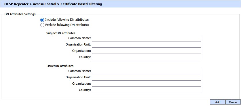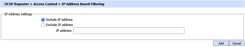 At least one "Include IP address" entry must be made before an "Exclude IP address" entry can be made. It is then necessary to restart the OCSP Repeater service to have the change take effect in the running system. |