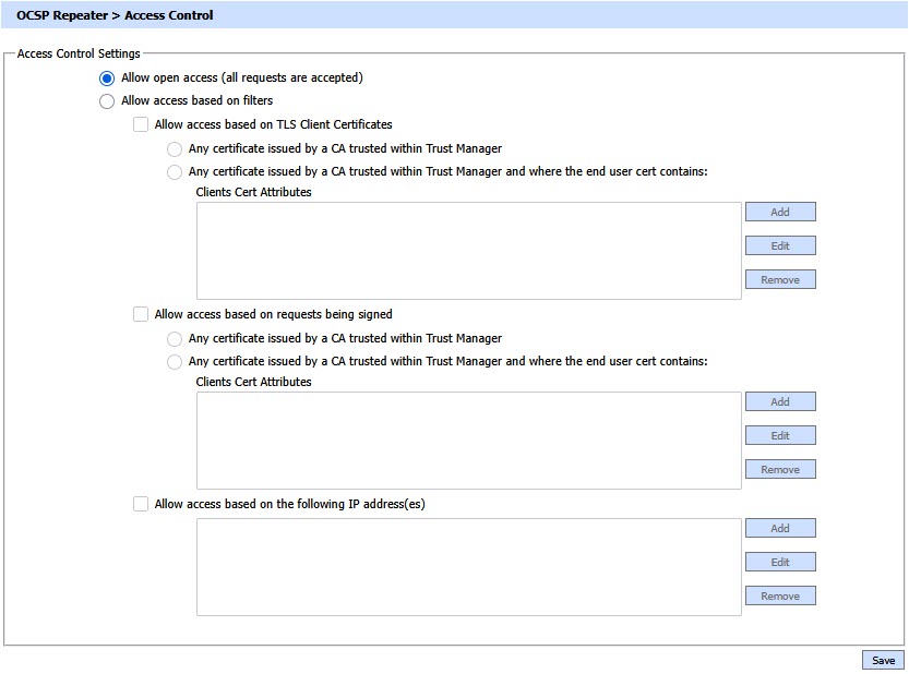 The OCSP Repeater access control module allows you to restrict the access of OCSP Repeater service based on the following options: