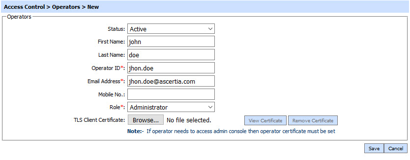 Import the TLS Client certificate to be used to authenticate this operator when access the ADSS console over TLS session. Use the browse button to locate the certificate.