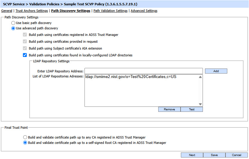 Select this option if you want the path discovery using configured LDAP repositories. Configure the LDAP repository address(es) from where the intermediate certificates can be found. Note: The Root CA must be registered in ADSS Trust Manager if you want path discovery using LDAP repositories. |