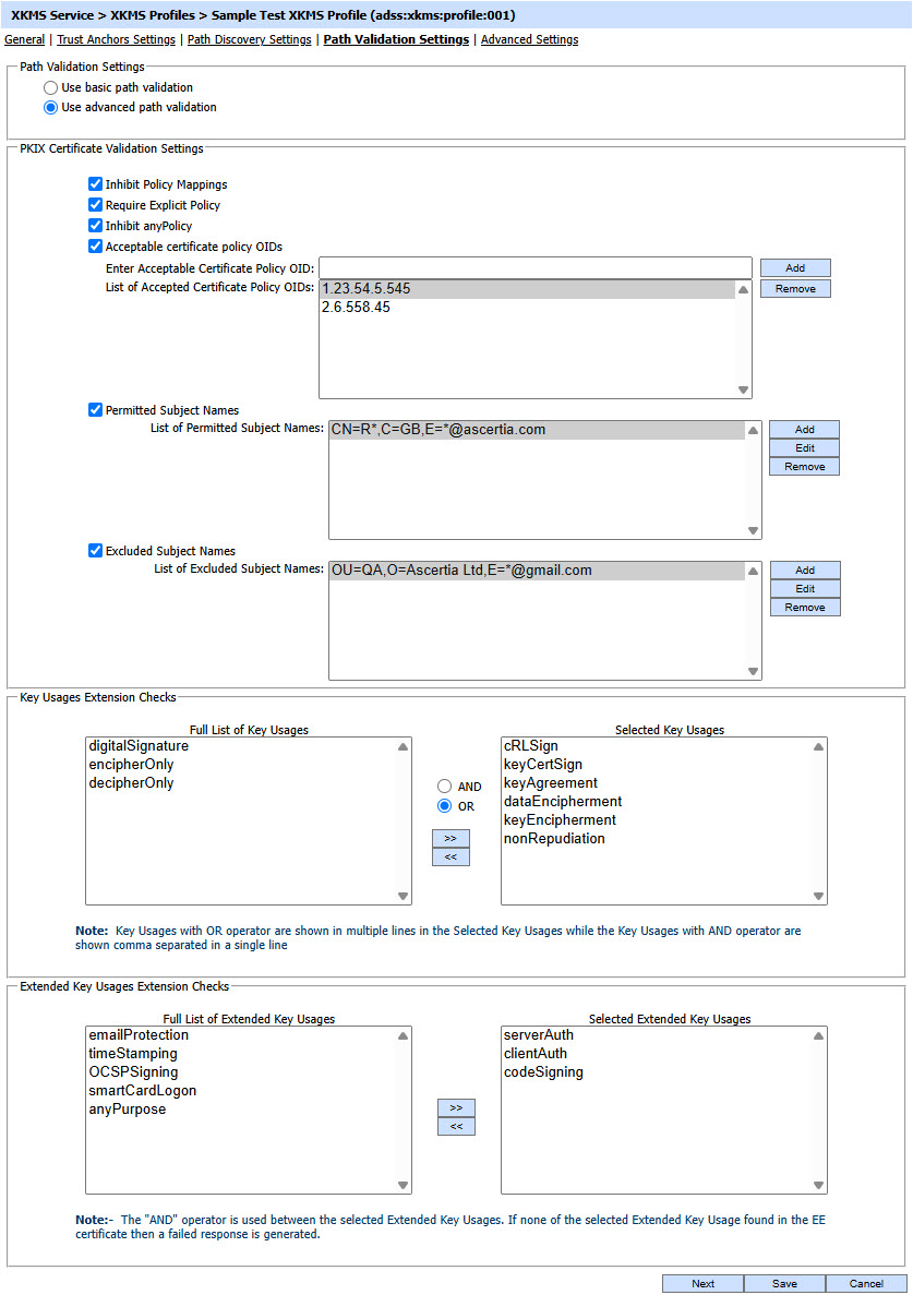 Path Validation Settings determine how the certificate chain (prepared via Path Discovery) will be validated.