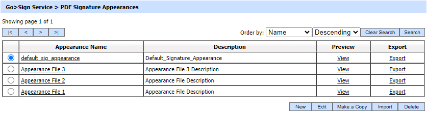 Existing PDF signature appearances can be sorted in either Ascending or Descending order by selecting a table column from the drop down list. The list of PDF signature appearances can be sorted by Name or Description.