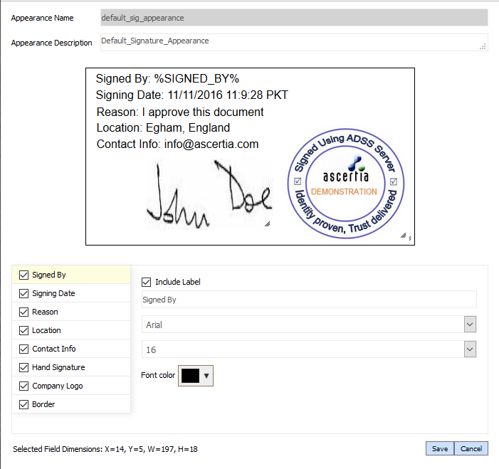 ADSS Signing Service provides a PDF signature appearance designer tool that allows detailed control over the signature appearance. Using this tool multiple signature appearances can be configured and linked with PDF Signing Profile. Different signature appearance attributes such as "signing reason", "location", "signer contact details", "signing date/time" can be defined. The ADSS Operator can also control the font style, color, font size and where to show these text items within the signature field. Images of items such as company logos and hand-signatures can also be added at precise locations within the signature field.
