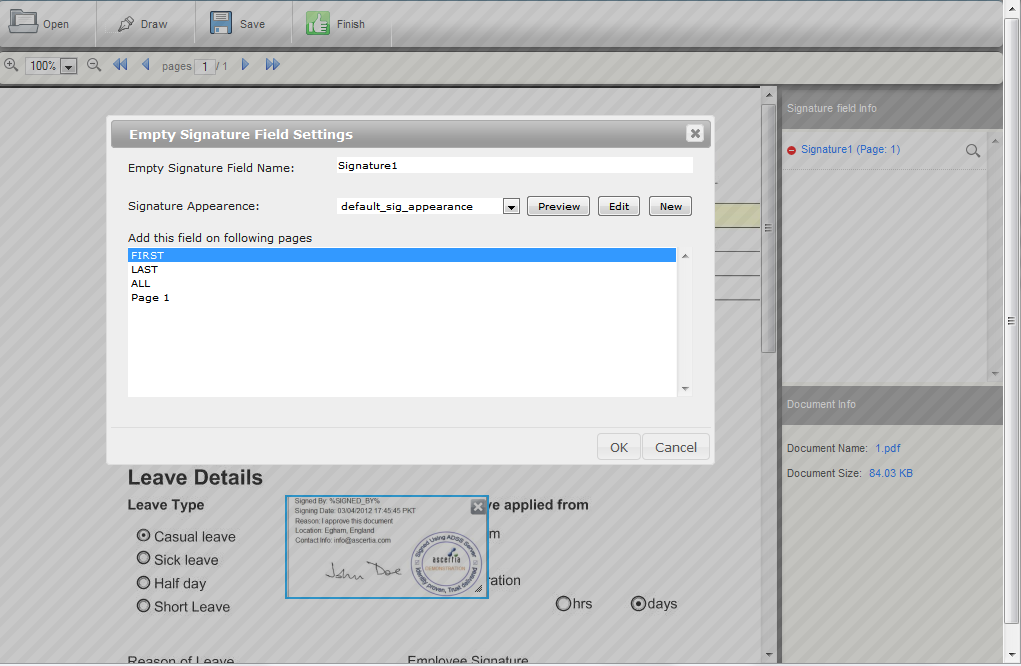 You can now open your PDF document in this editor by using the Open option on toolbar. Once the document is opened, go to the page/location where you wish to create the empty signature field for visible signatures. Click Draw button at tool bar to add blank signature field at the desired location. Use your mouse to draw the field to match your exact needs, and once done a popup will be shown as in the above screen where you can link this field with signature appearance. The operator can view the signature appearance by selecting the signature appearance from the drop-down and clicking the preview button.
