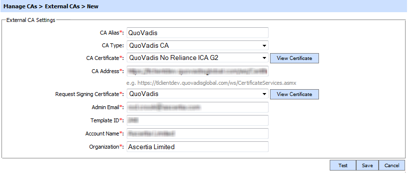 To configure the QuoVadis CA as an external CA select the QuoVadis CA from the CA Type drop down. The following page will be shown to configure the QuoVadis CA: