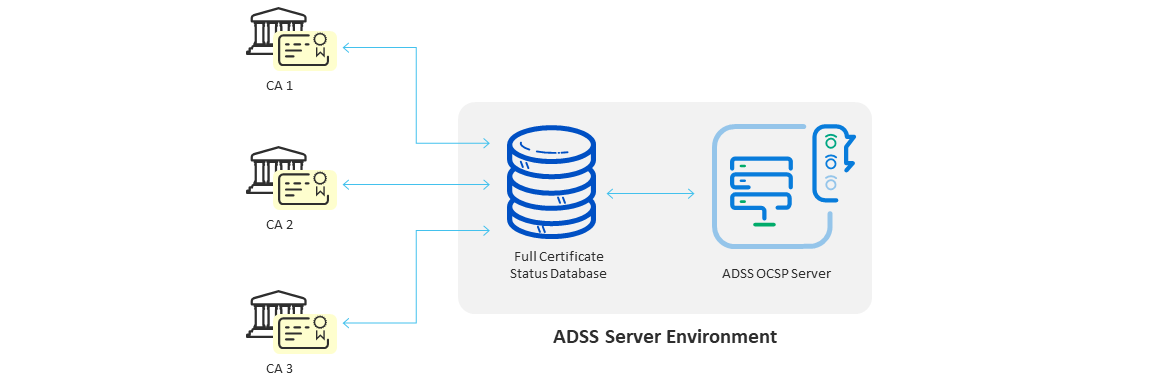 With this up-to-date information on certificate revocation information in place, ADSS Server can provide real-time information on certificate revocation status. The process flow is as follows:
