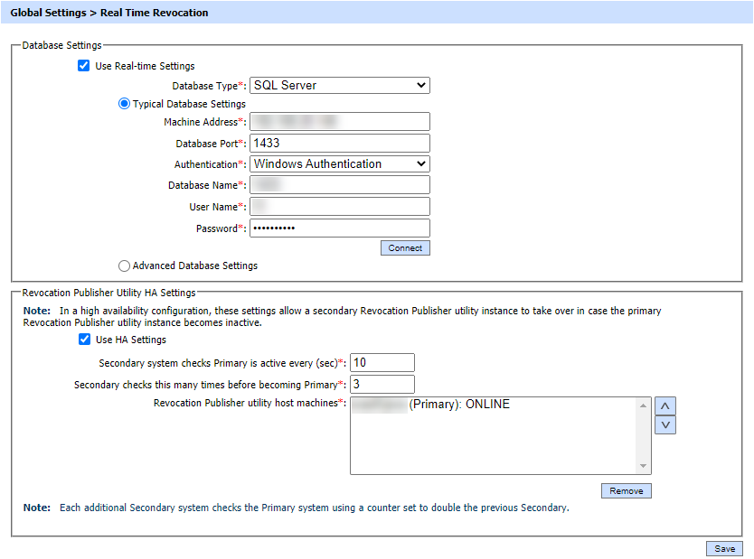For the Revocation Publisher Utility HA Settings option, once a successful connection is established with the database, a success message will be shown and the HA Setting fields will be populated with the default values and the machine name on which the RPU is installed. High Availability (HA) configurations of RPU work similarly to HA configurations of CRL Monitor. To get more information about HA configuration click here.