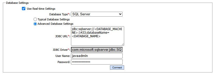 Enter the JDBC URL is a database connection string. This is useful for configuring a connection string manually or for database connection pooling i.e. the connection string provides details of the individual database server name, port, user ID and password running in a database pooled environment. To configure JDBC URL for connecting to SQL server using Windows Authentication, use the below connection string: